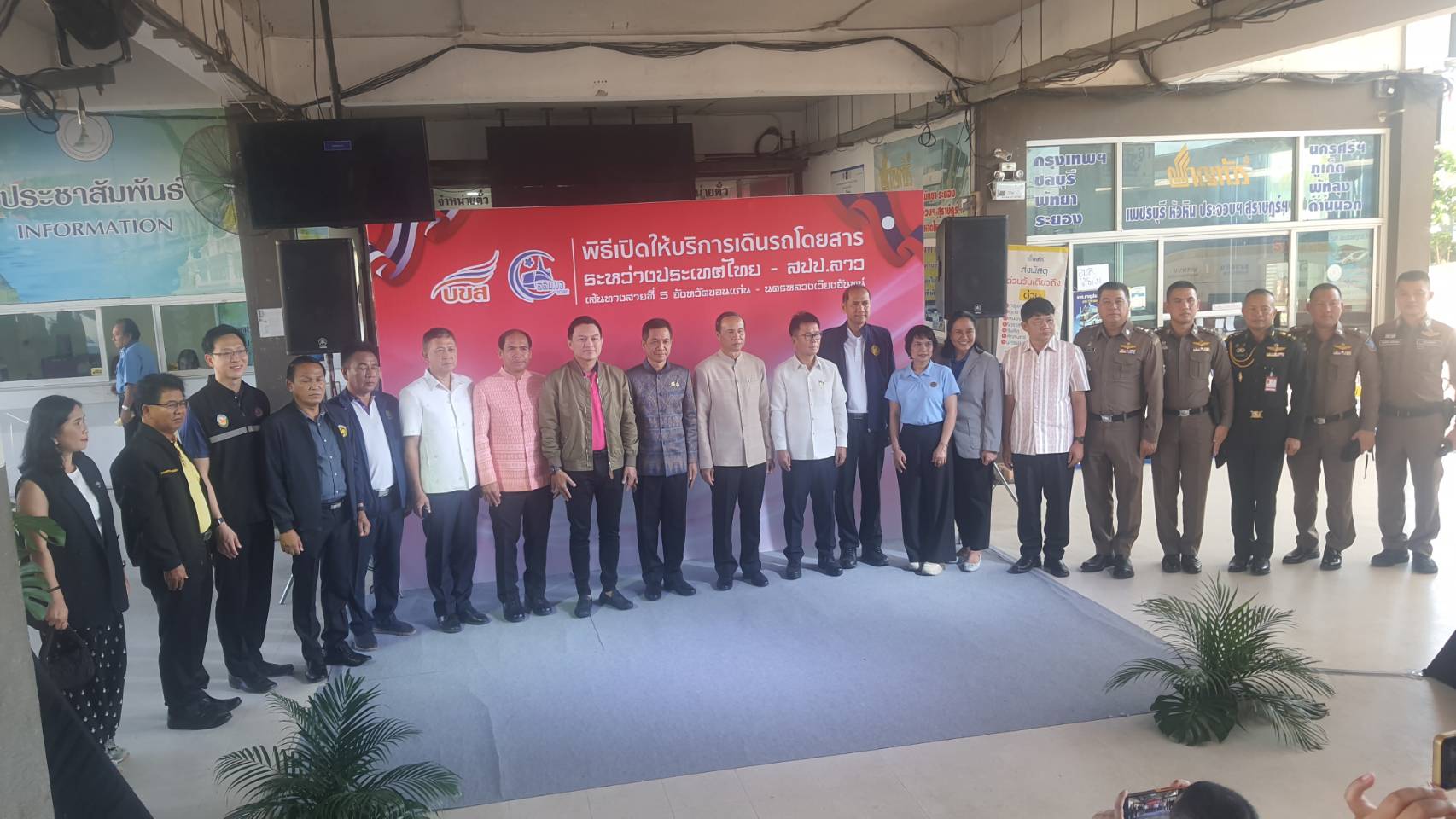 ในพิธีเปิดให้บริการเดินรถโดยสารระหว่างประเทศไทย – สปป.ลาว เส้นทางสายที่ 5 จังหวัดขอนแก่น – นครหลวงเวียงจันทร์โดยมีนายอรรถวิท รักจำรุญ กรรมการผู้จัดการใหญ่ บริษัท ขนส่ง จำกัด (บชส.), นายสมสัก  วิไลทอน กงสุลใหญ่ สปป.ลาว ประจำขอนแก่น, นายแก้ววันพอน วอนทิวงสี ผู้อำนวยการรัฐวิสาหกิจรถเมล์นครหลวงเวียงจันทน์ ผู้บริหารหน่วยงานในสังกัดกระทรวงคมนาคม หน่วยงานภาครัฐและภาคเอกชน แขกผู้มีเกียรติ และสื่อมวลชนเข้าร่วมฯ ณ สถานีขนส่งผู้โดยสารจังหวัดขอนแก่น แห่งที่ 3