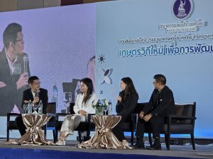 ช่วงที่สอง นำเสนอหัวข้อ “เพิ่มผลผลิต ลดต้นทุน ด้วยเทคโนโลยีเกษตร” โดย รศ.ดร.ขวัญตรี แสงประชาธนารักษ์ คณะวิศวกรรมศาสตร์ มหาวิทยาลัยขอนแก่น ได้ยกคำถามสำคัญ คือ เหตุใดเกษตรกรไทยจำนวนมากยังไม่ใช้เทคโนโลยีในการทำเกษตร โดยพบว่าปัญหาหลักคือ เกษตรกรยังไม่มั่นใจว่าการลงทุนด้านเทคโนโลยีจะคุ้มค่าหรือไม่ เพราะถึงแม้ผลผลิตจะมีคุณภาพมากขึ้น แต่ราคาที่ได้รับกลับไม่สะท้อนคุณภาพที่แท้จริง เนื่องจากระบบรับซื้อยังเน้นปริมาณมากกว่าคุณภาพ ทำให้เกษตรกรขาดแรงจูงใจในการลงทุน อีกเหตุผลสำคัญ คือ การขาดบุคลากรที่มีความรู้ด้านเทคโนโลยีการเกษตร เนื่องจากคนรุ่นใหม่เข้าสู่อาชีพเกษตรน้อยลง แรงงานส่วนใหญ่ที่เป็นผู้สูงวัยไม่กล้าลงทุน เพราะขาดผู้สืบทอดเครื่องมือเครื่องจักร อย่างไรก็ดี เริ่มเห็นเกษตรกรตัวอย่างที่ประสบความสำเร็จ เช่น กลุ่มทำนาประณีตที่ชัยภูมิ กลุ่มทายาทอ้อยร้อยล้านน้ำตาลบุรีรัมย์ ที่อาศัยองค์ความรู้ใหม่และมีแนวคิดว่า การทำเกษตรด้วยเทคโนโลยีสามารถสร้างรายได้และเป็นอาชีพที่มั่นคงได้ เช่น ผู้ให้บริการโดรนสำหรับพ่นปุ๋ย-พ่นยา หรือ ธุรกิจ SMEs ที่ให้เช่าเครื่องจักรเกษตรสมัยใหม่ ซึ่งจะทำให้ระบบนิเวศด้านเทคโนโลยีเกษตรเติบโต และเกษตรกรมีทางเลือกใหม่ที่จะช่วยลดต้นทุน เพิ่มผลผลิต และเพิ่มรายได้ในระยะยาว